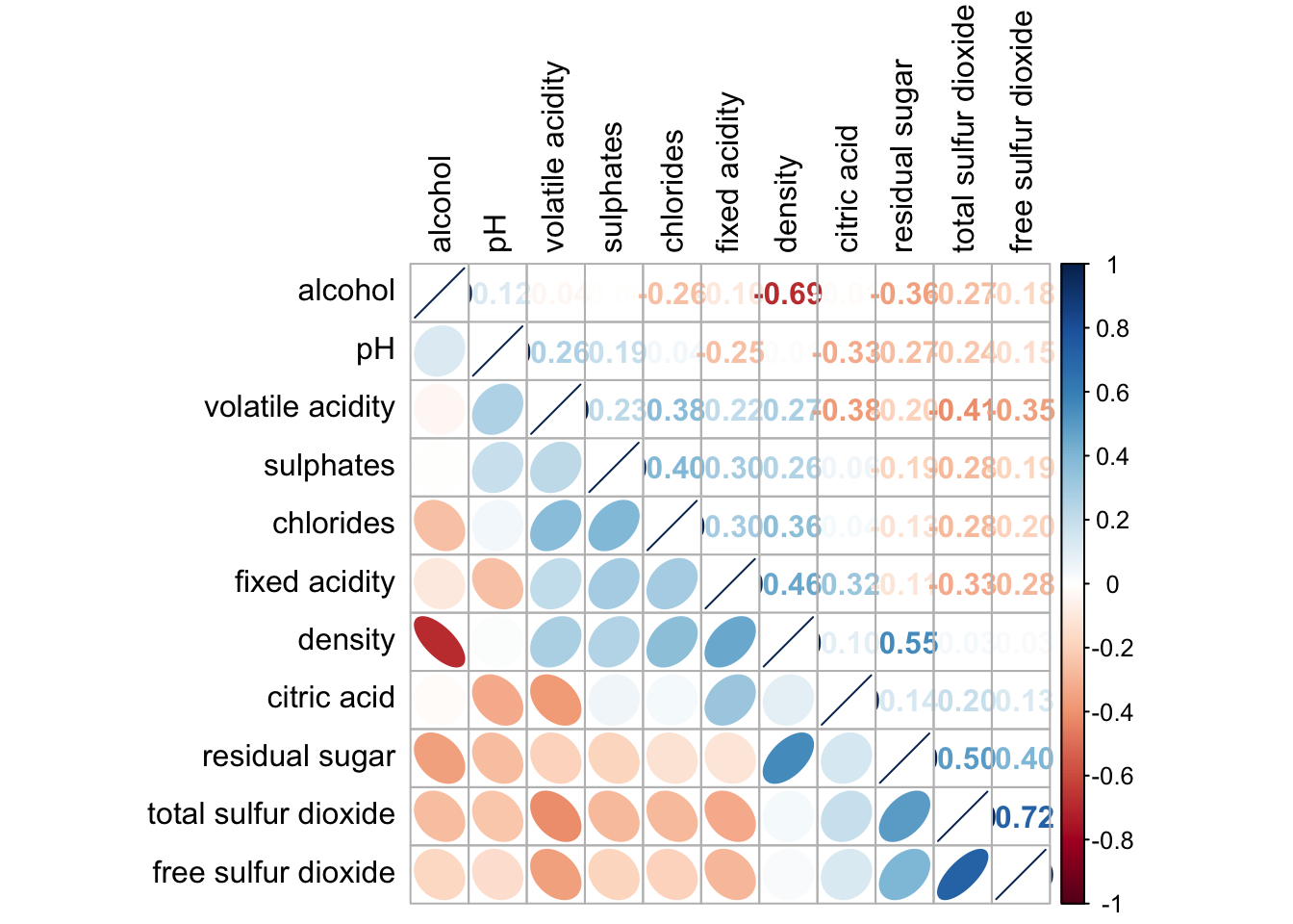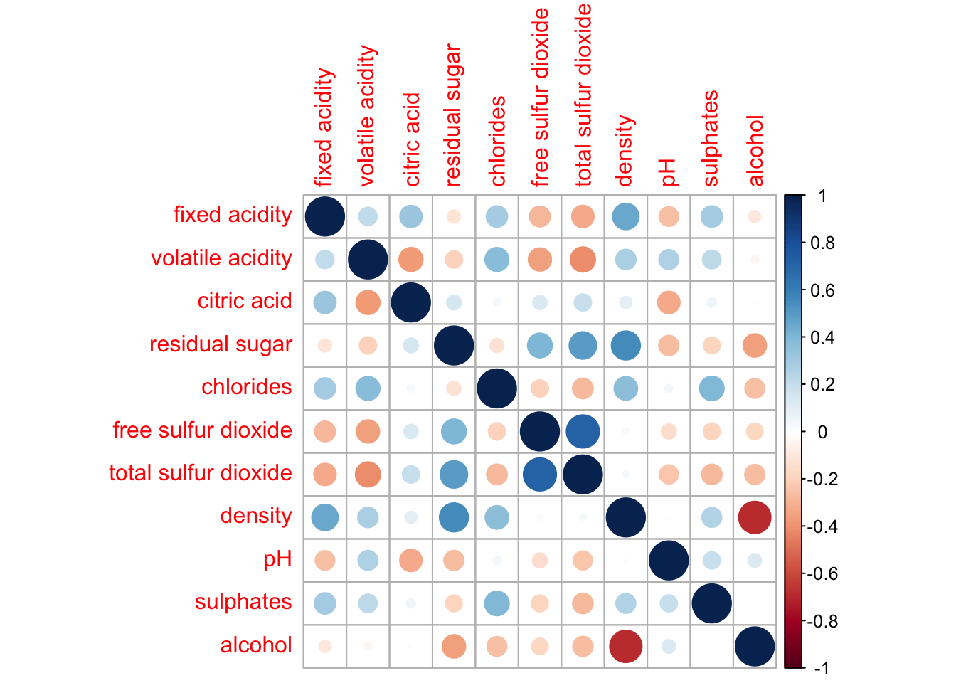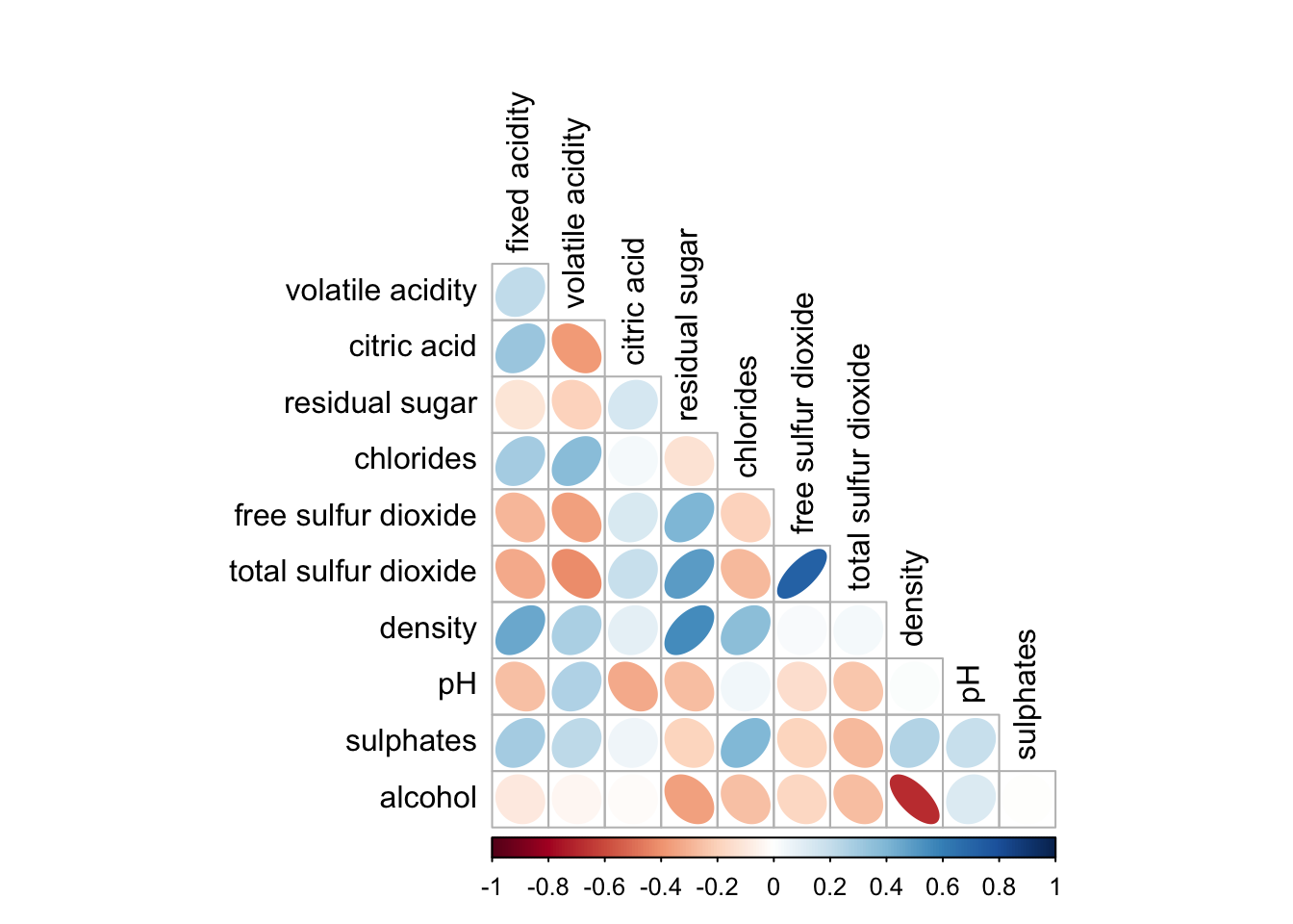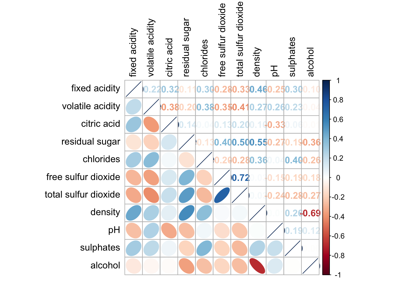 wine.cor <- cor(wine[, 1:11])Next, corrplot() is used to plot the corrgram by using all the default setting as shown in the code chunk below.