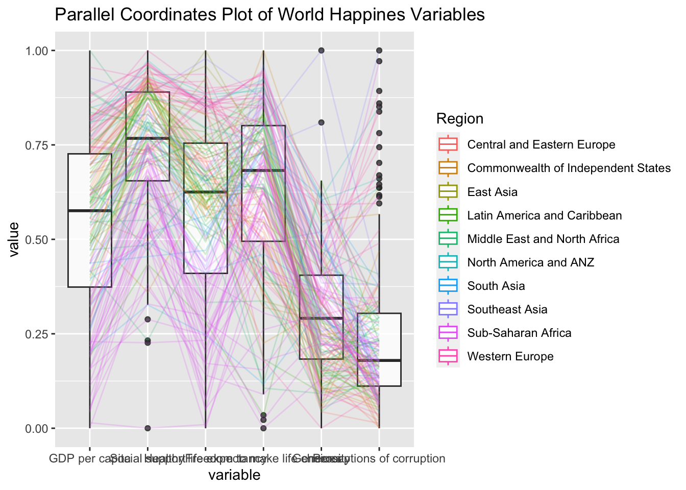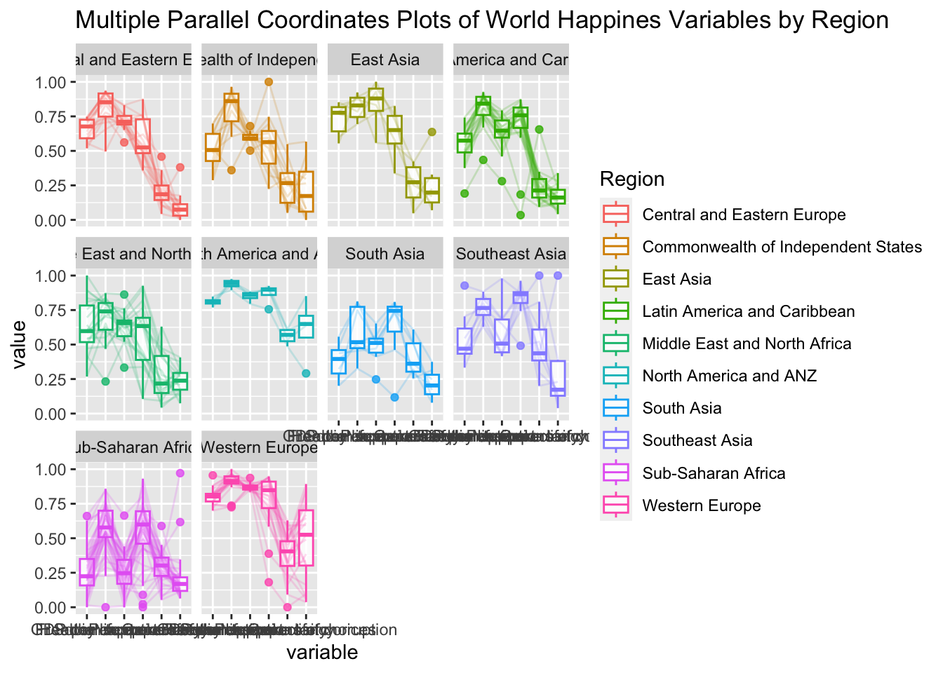 title = "Multiple Parallel Coordinates Plots of World Happines Variables by Region") +