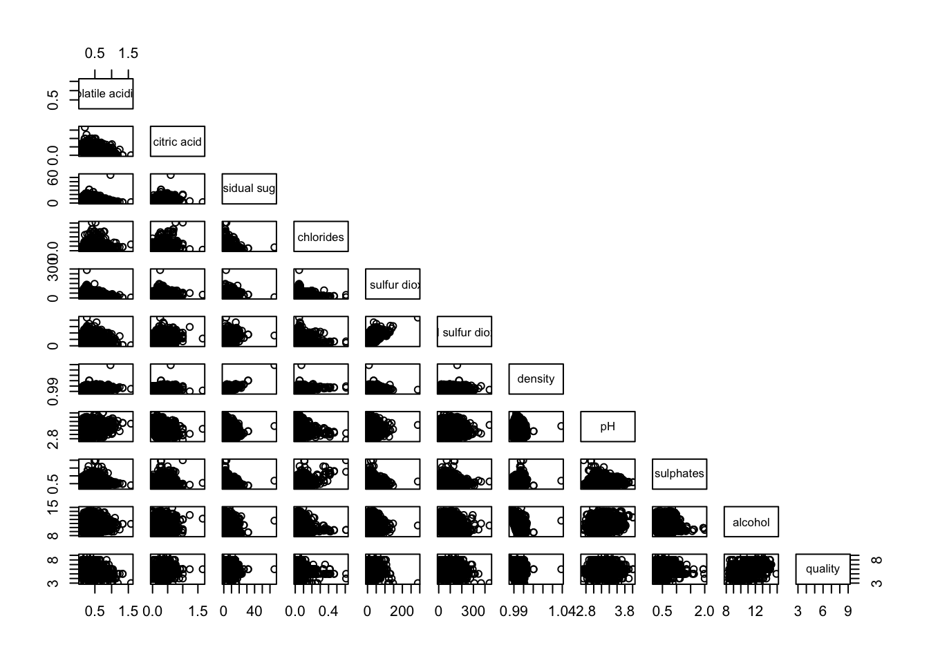 pairs(wine[,2:12], upper.panel = NULL)